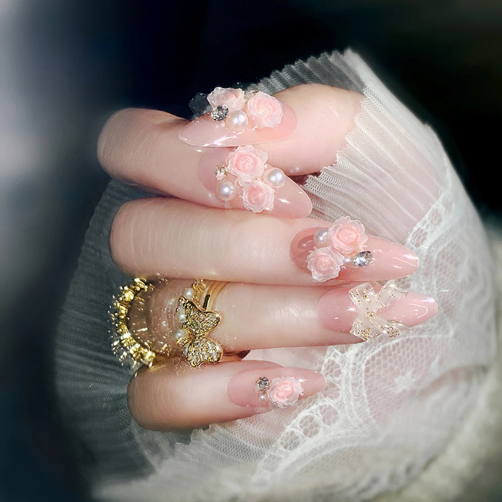 Light Blue Fake Nails Long Ballerina Press on Nails Blue Flower Butterfly Designs Korean Fashion Bride Wedding Charms Nails Art