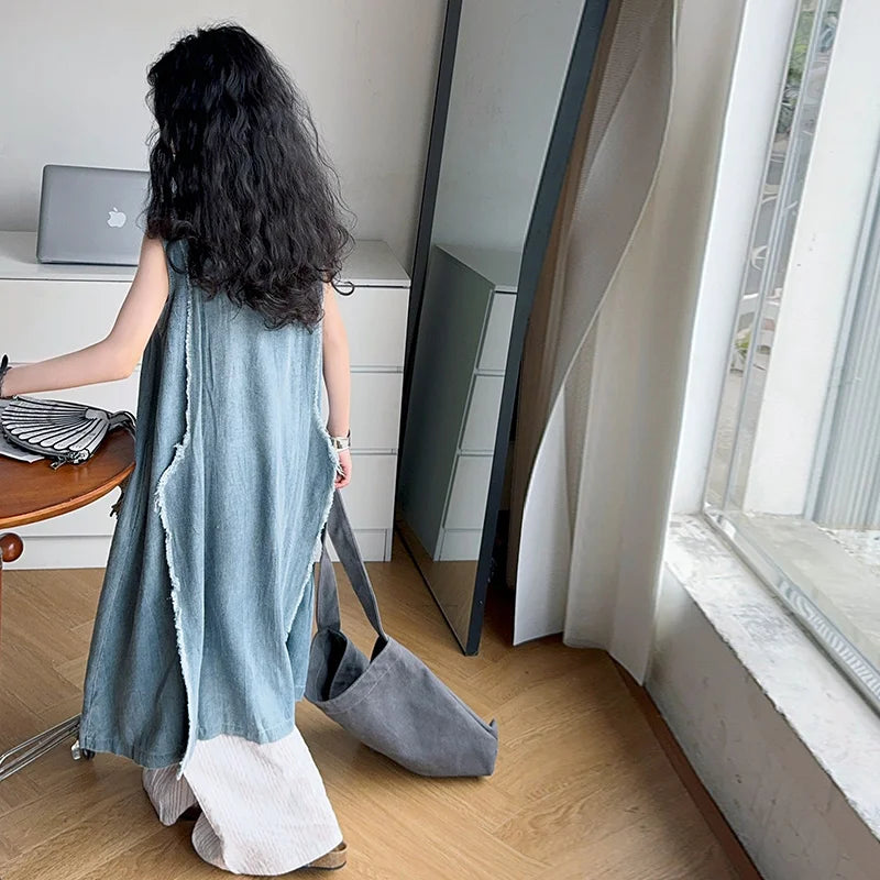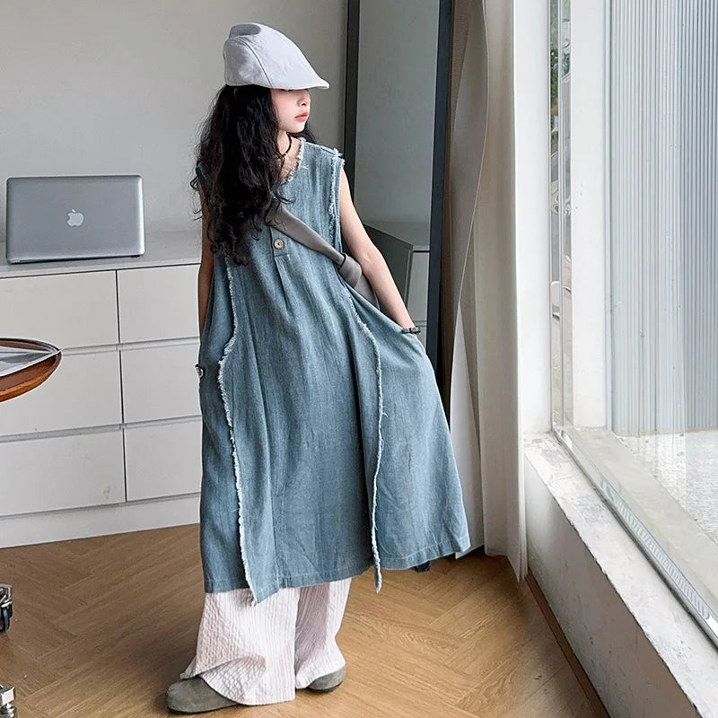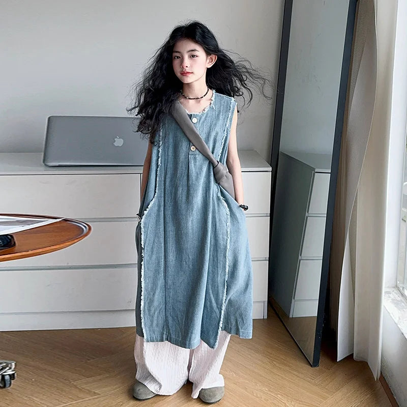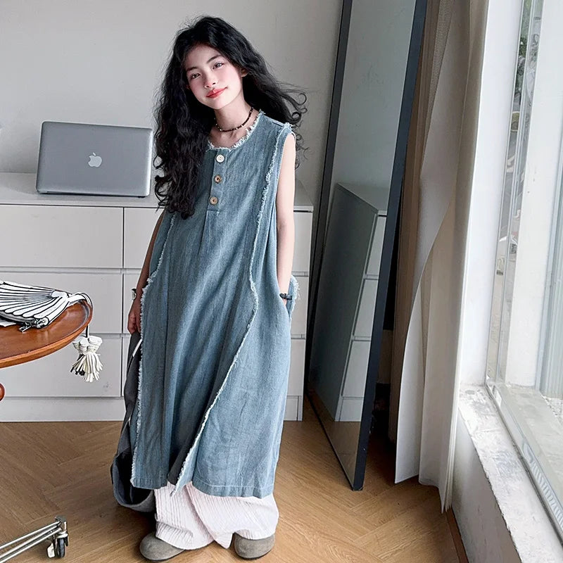 Loose Style Kids Luxury Summer Denim Dresses for Teenage Girl High Fashion Street Outfits Children Casual Sleeveless Jeans Dress