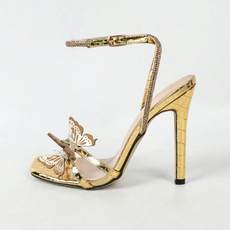Luxury Crystal Narrow Band High Heel Sandals Women Fashion Metal Butterfly Decoration Brand Designer Shoes Sexy Party Dress Shoe