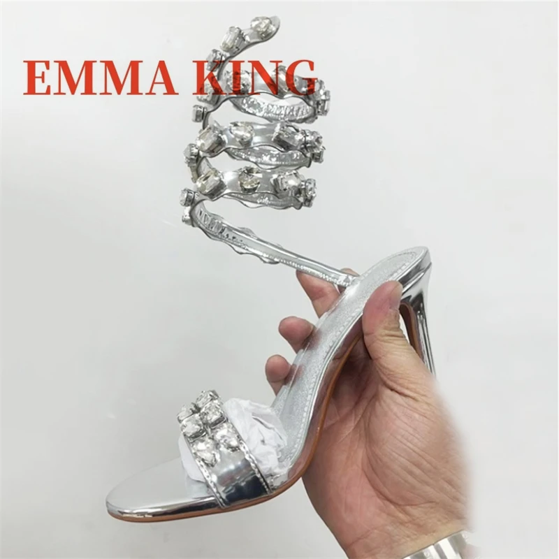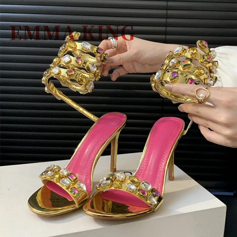 Luxury Gold Rhinestone Studs Sandals Women's Stiletto High Heels Sandals Sexy Ankle Wrap Summer Shoes For Weddings And Parties