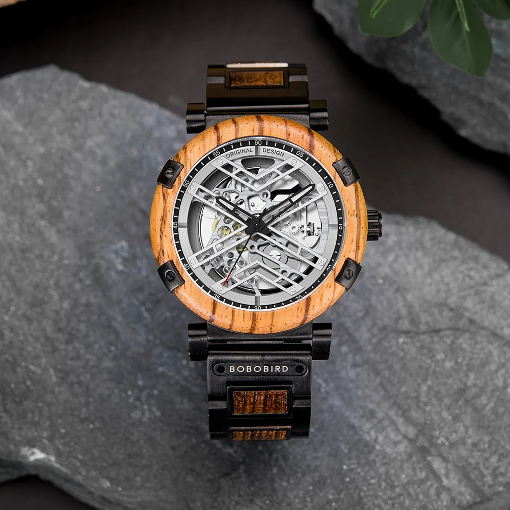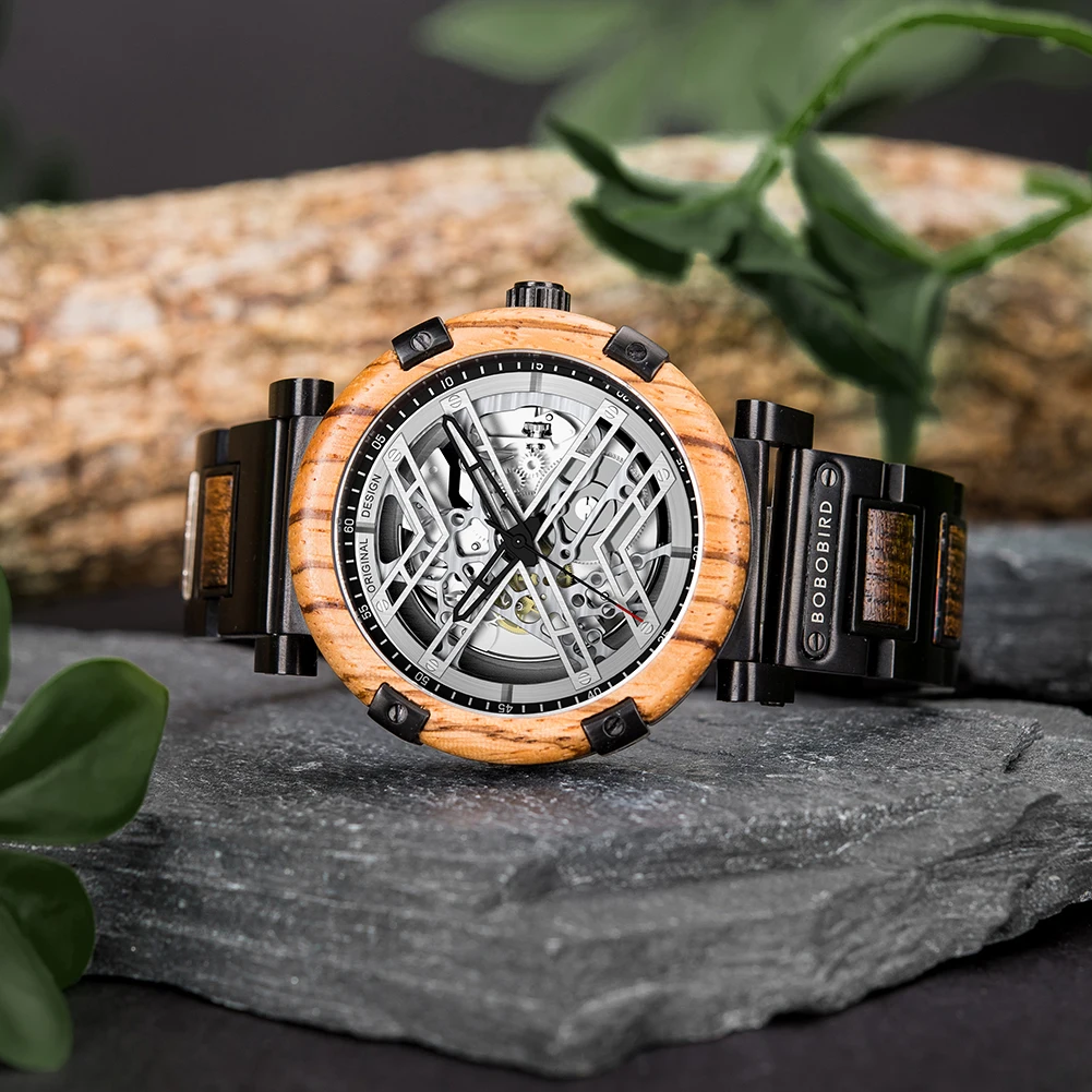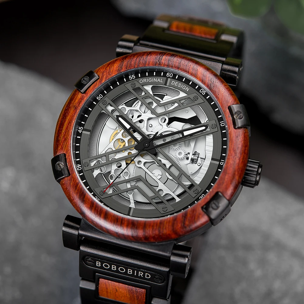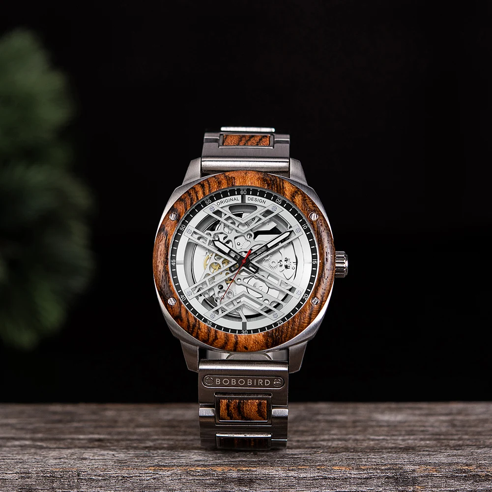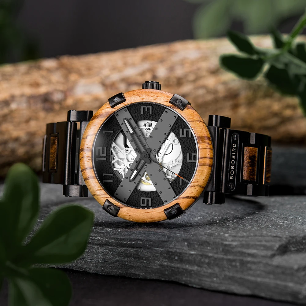 Men Watch BOBO BIRD Wooden Automatic Mechanical Watch Metal Wristwatch Top Fashion Business Clock Custom Gift Box reloj hombre