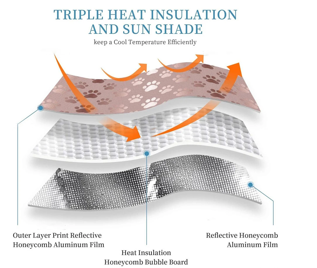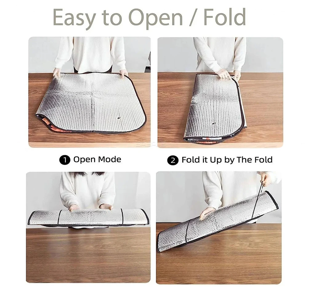 MATERIAL:The front window sun shade use 100% polyester and Reflective aluminum foil with thicken layer bubble make the cooling effect is more significant. Heat resistant, Lightweight and portable.