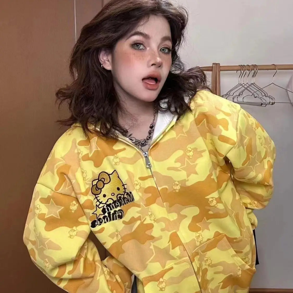 Miniso Cartoon Hello Kitty Hooded Zipper Sweater Kawaii Y2K Couple Cardigan Pure Cotton Camouflage Jacket Trendy Christmas Gift