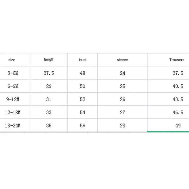 3-6 Months Tops Length: 27.5 / 10.83 Bust: 48 / 18.90 Pant Length: 37.5 / 14.76