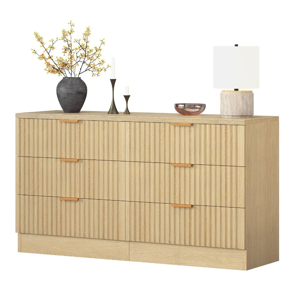 Oak 6 Drawer Dressers with Fluted Pane TV Stand Drawer Cabinet for Living Room