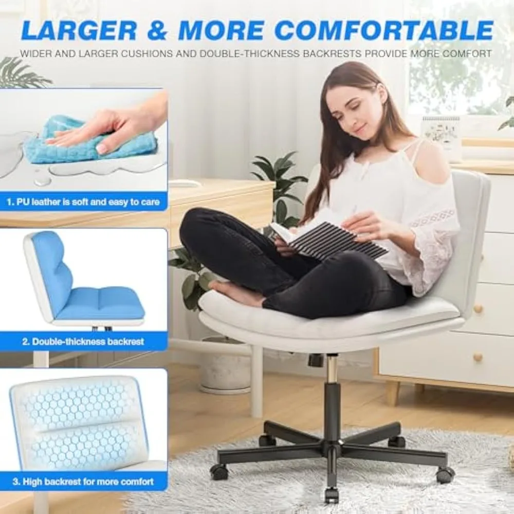 - SOFT & WIDE & FIRM - PROVIDE YOU WITH A BETTER SITTING FEELING: This spacious criss cross desk chair is fabricated from double-layer high-density sponge cushions, where the upper layer is soft yet resilient, and the lower layer offers firm and robust support. Even if you sit for an extended period, you won't experience back pain, and fatigue will be significantly reduced. The widened and enlarged soft cushion caters to your diverse sitting habits, and sitting cross-legged will be easy. The surface of the armless chair is crafted from PU material, which is not only skin-friendly and supple but also durable and waterproof, making it your optimal choice.
