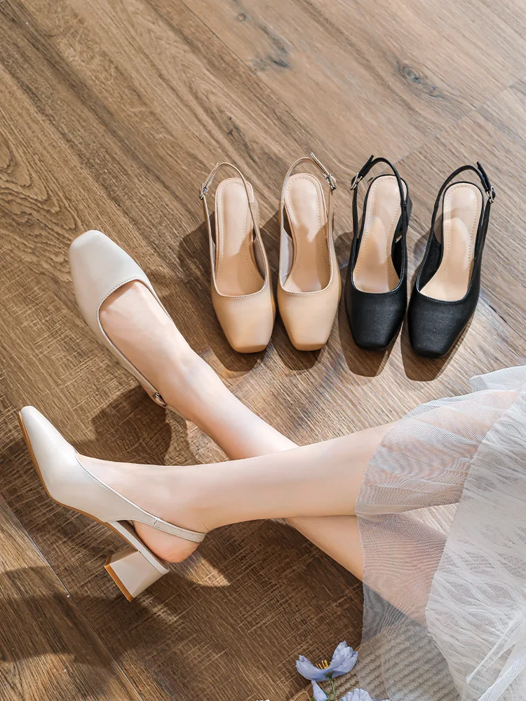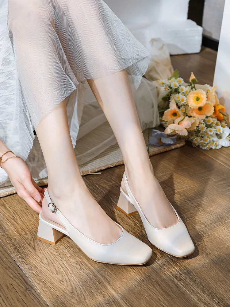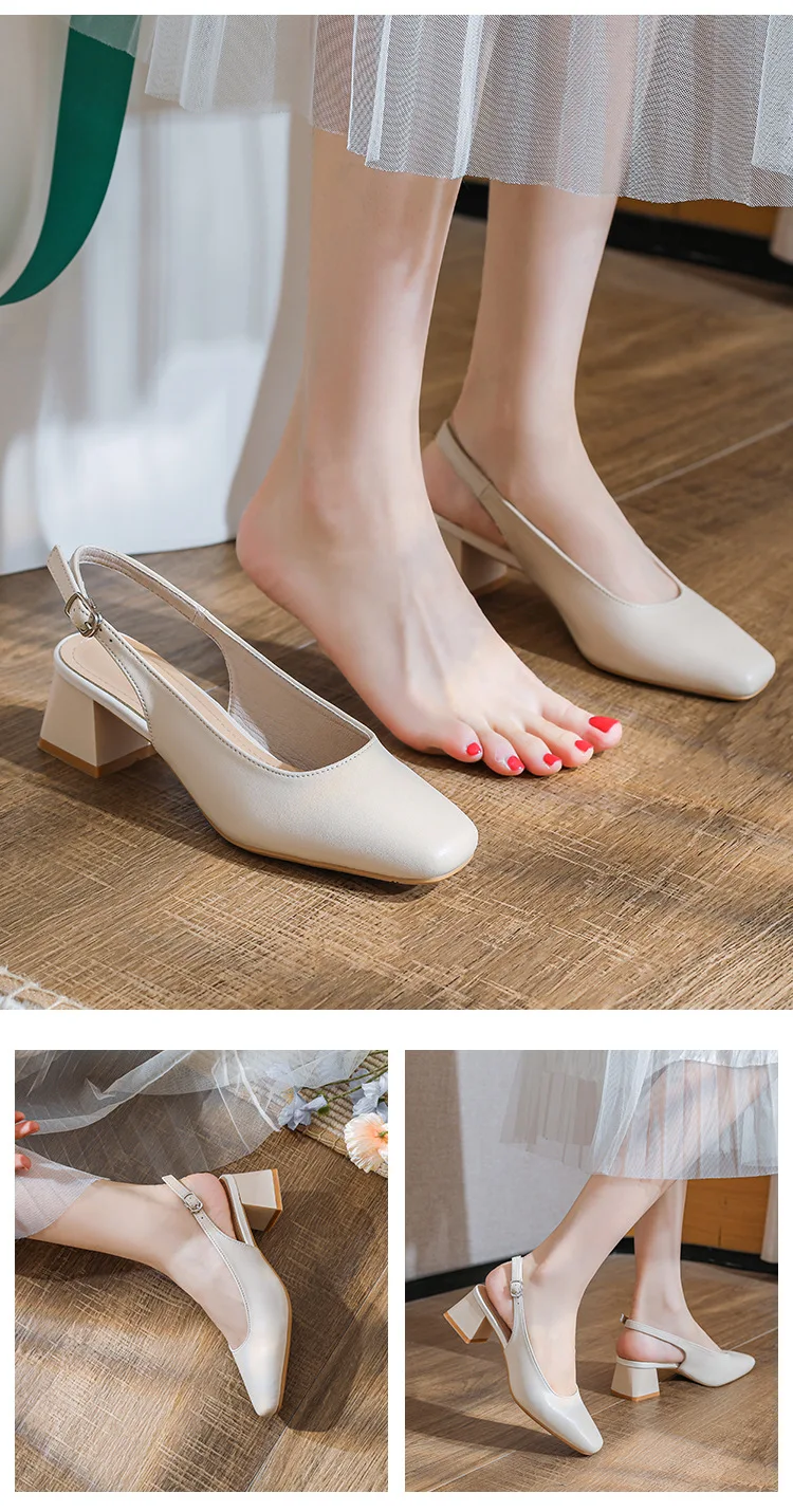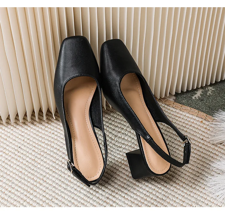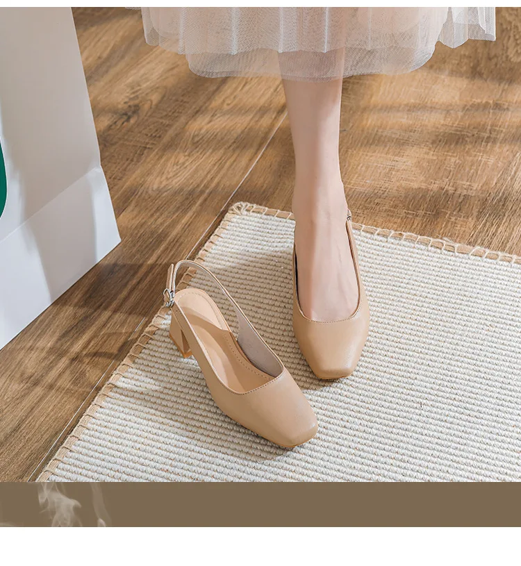 Oulylan Women Trendy Buckle Strap Sandals Plus Size Thick Heeled Slipper Summer Square-toed High Heels Elegant Pure Color Sandal