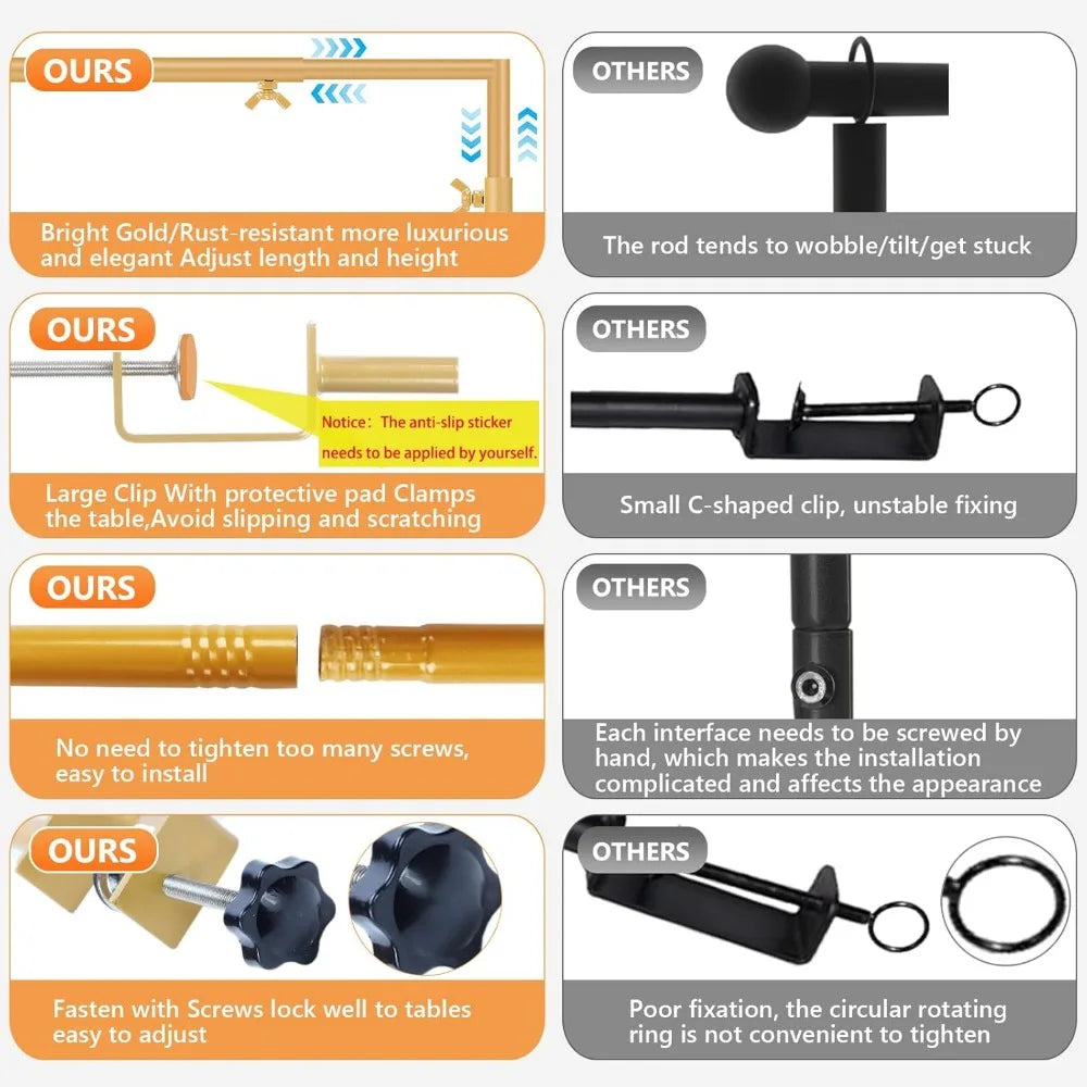 - Easy to assemble: No need to screw too many screws, just rotate the tubes to connect. Clamp the table rod to the table and adjust the appropriate length and height as needed.