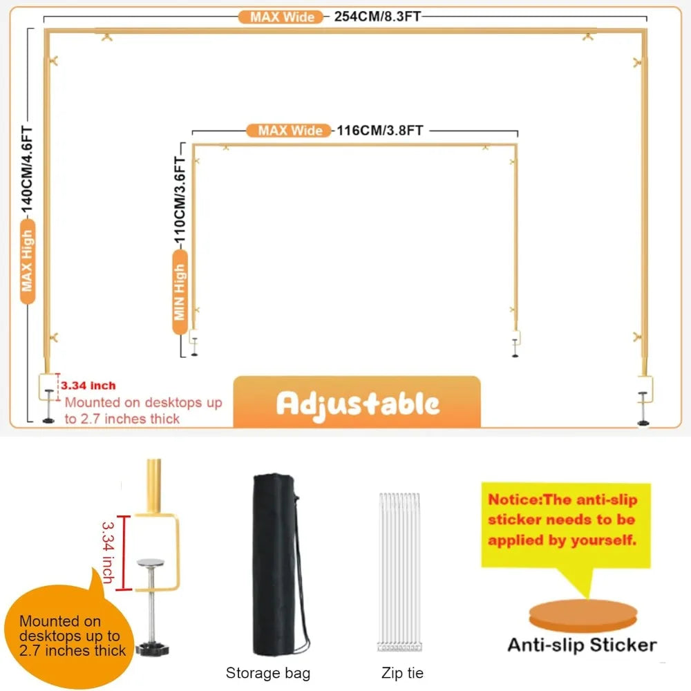 Over The Table Rod Stand with Clamps Adjustable 46"-100'' Length 29"-55" Height Gold Table Balloon Arch Stand with Storage Bag,
