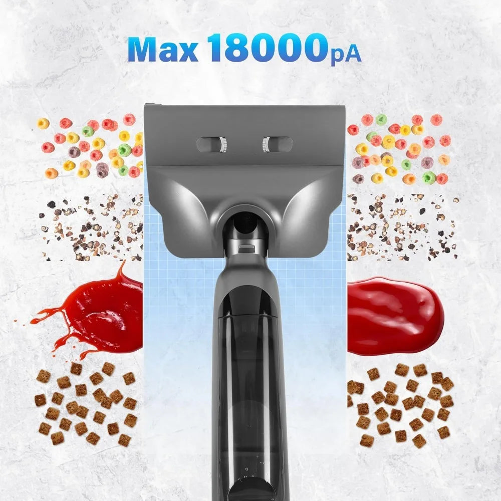 This versatile 2-in-1 vacuum and mop combo is designed to save time and effort by tackling dirt, spills, and carpet messes in a single go without switching tools. Its self-cleaning feature automatically washes the mop head after use, eliminating the need for manual cleaning. Equipped with an upgraded high-speed motor, it delivers a powerful 18000Pa suction to lift pet hair, crumbs, and debris from various surfaces. The anti-tangle brush design prevents hair from wrapping around, making it perfect for pet owners and those with long hair. With a large 5000mAh battery, it offers up to 50 minutes of runtime, enough to clean over 3000 sq ft without recharging. The dual separate tanks ensure clean water is used for mopping at all times, preventing cross-contamination. This model also features chemical-free disinfection using electrolytic water, a built-in HEPA filter to trap dust and allergens, and the option to add aromatherapy tablets for a fresh scent. The lightweight, cordless design and 360° rotating head make it easy to reach every corner of your home, including under beds and into tight spaces, providing a thorough clean on hard floors, carpets, and at tricky angles.