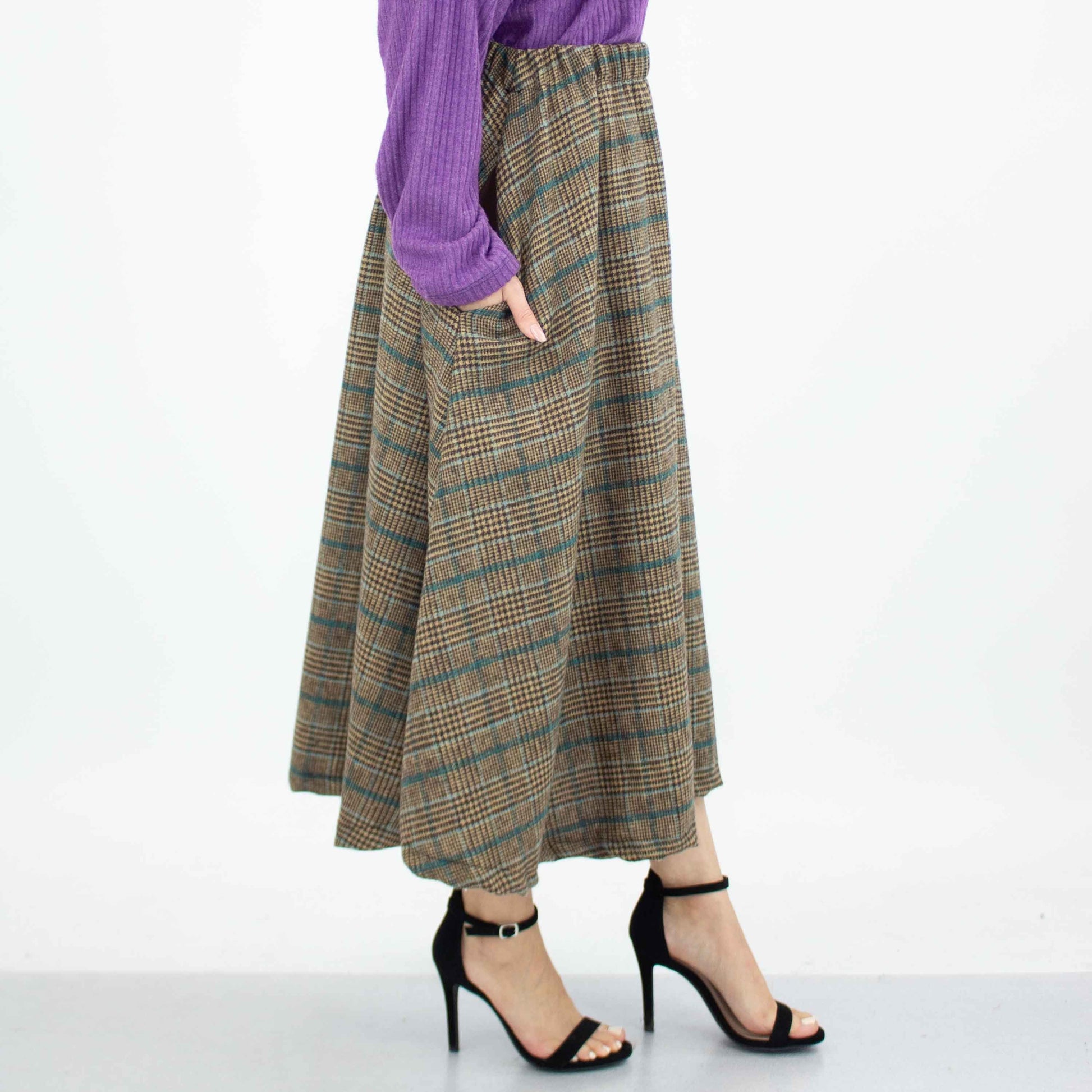 Plaid Flare Midi Skirt with Side Pockets - Blue