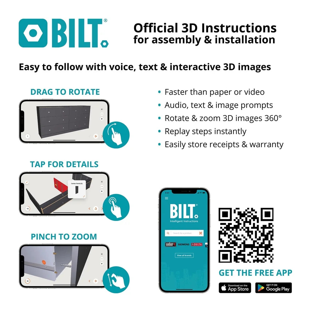 3D Interactive assembly through BILT: Instructions for this product are available through the free BILT app. Find a revolutionary way to assemble & install product with voice, text, & interactive animated images