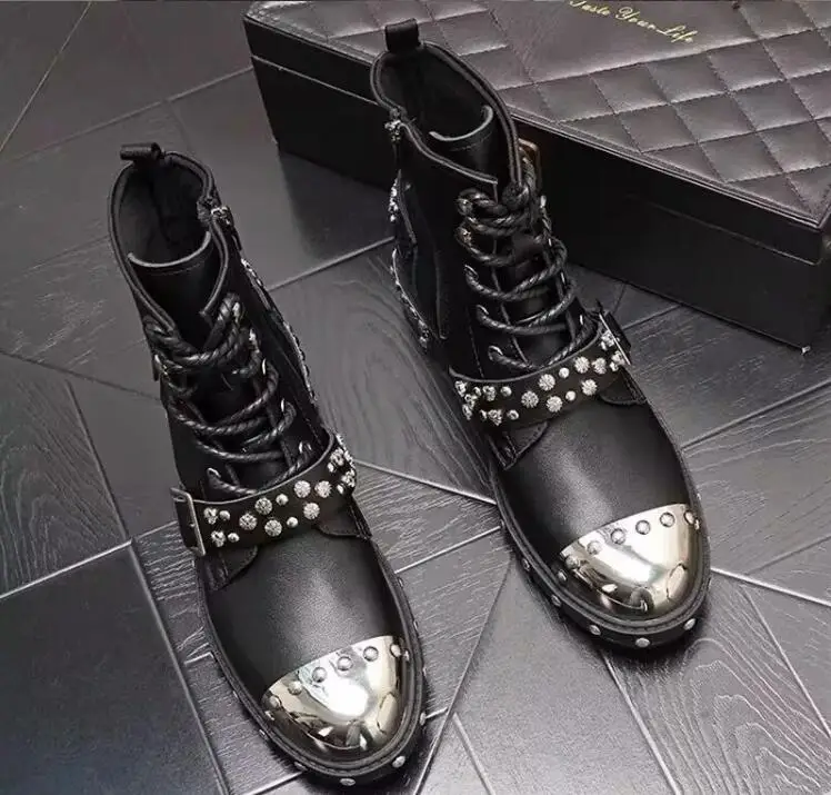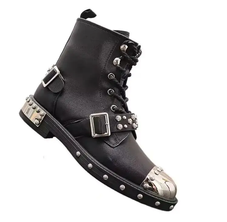 Punk Style Metal Toe Rivets Studs Buckle Strap Chelsea Boots Men Black Leather Motorcycle Boots Shoes Man Zapatos Hombre