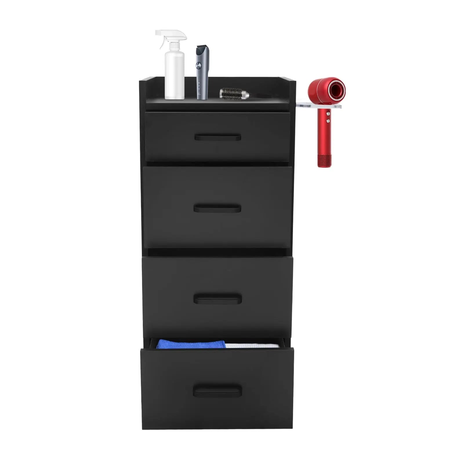 ExcellentStorageFunction:theSalonTrolleyCartWithFourDrawersHelpYouCategorizeAndStoreVariousHairdressingToolsAndSuppliesSuchAsScissors, combs, sprayBottles,etc.ForYourConvenience.HairDryerHolderHoldsTheHairDryerForYourConvenience