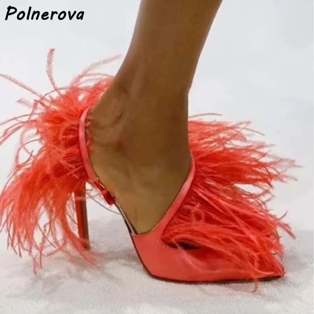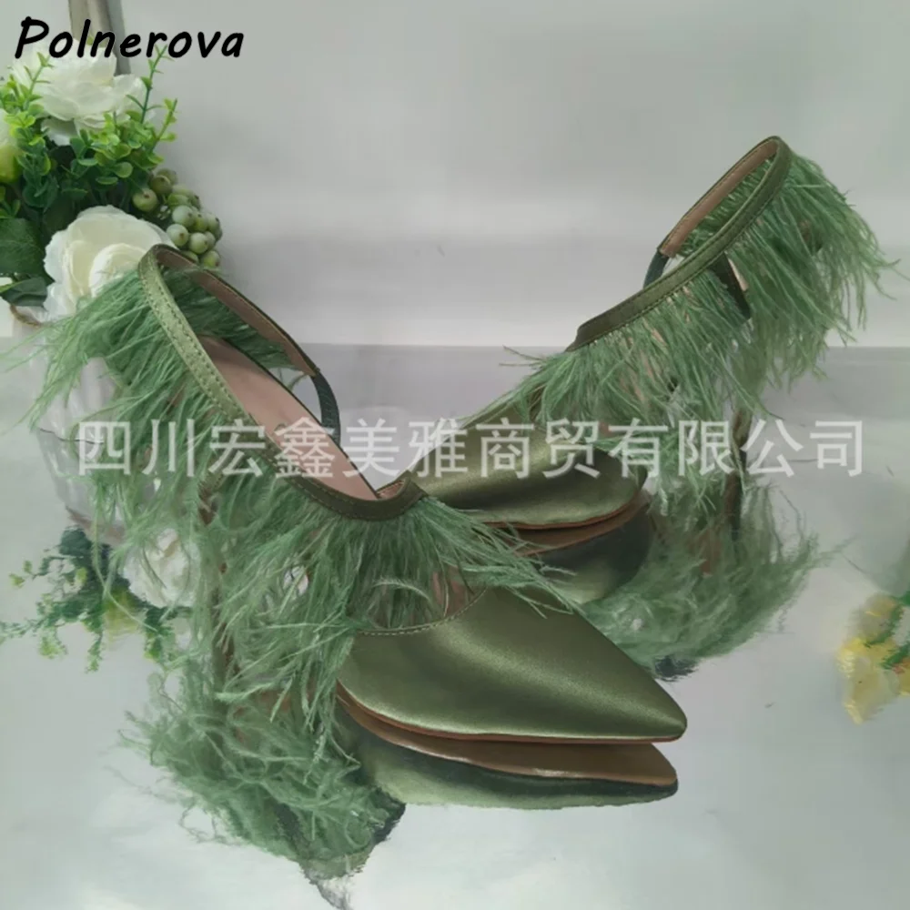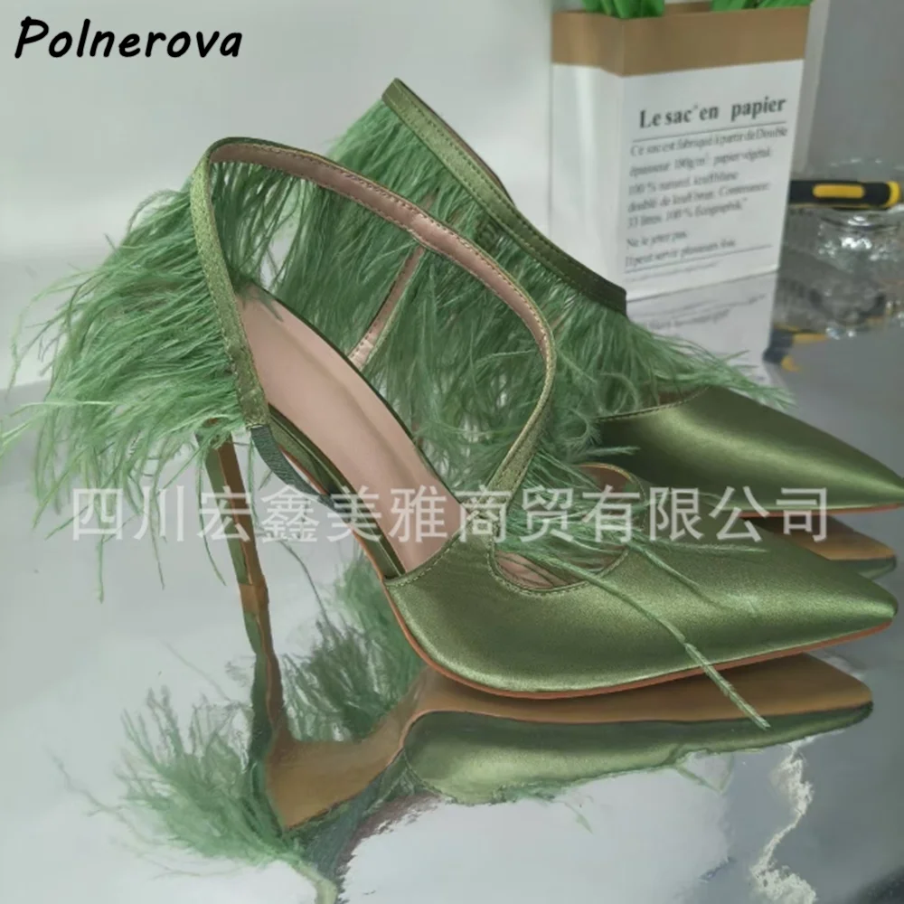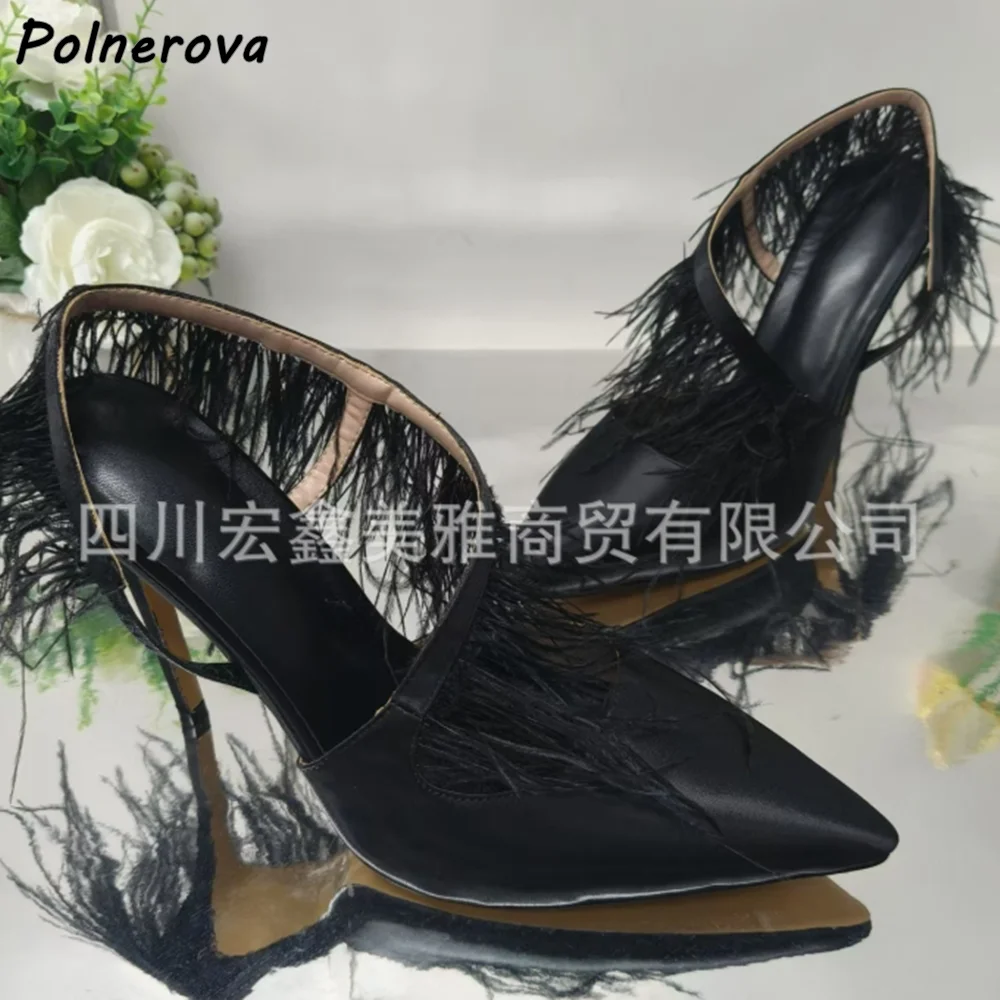 Satin Surround Feather Fringe Sandals Pointy Toe Solid Pointy Toe Stiletto Shoes Red Orange Black Summer Shallow Runway Shoes