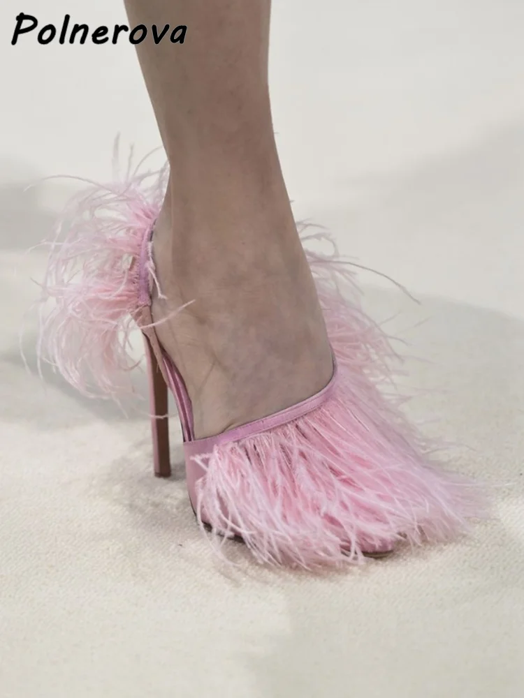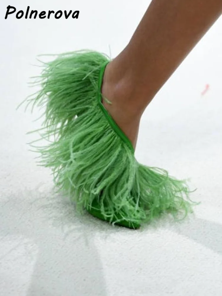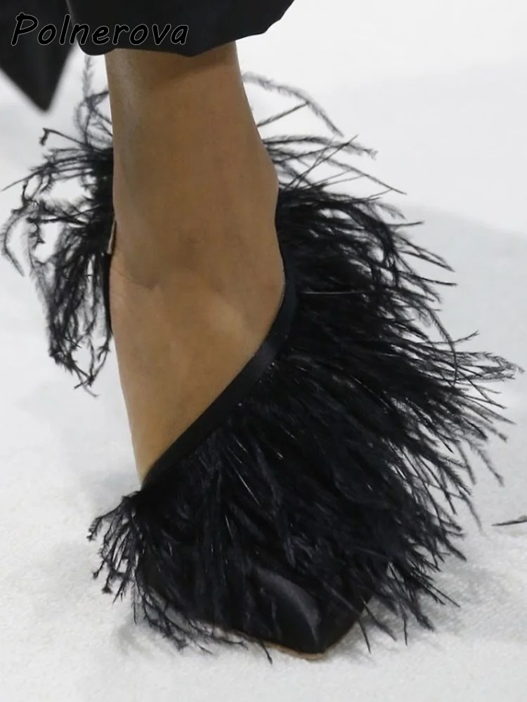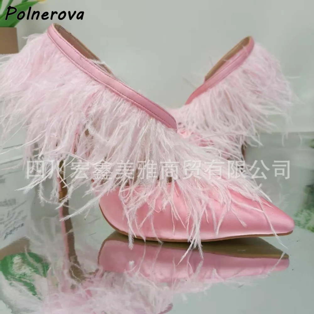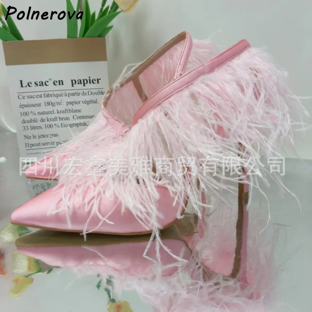 Satin Surround Feather Fringe Sandals Pointy Toe Solid Pointy Toe Stiletto Shoes Red Orange Black Summer Shallow Runway Shoes