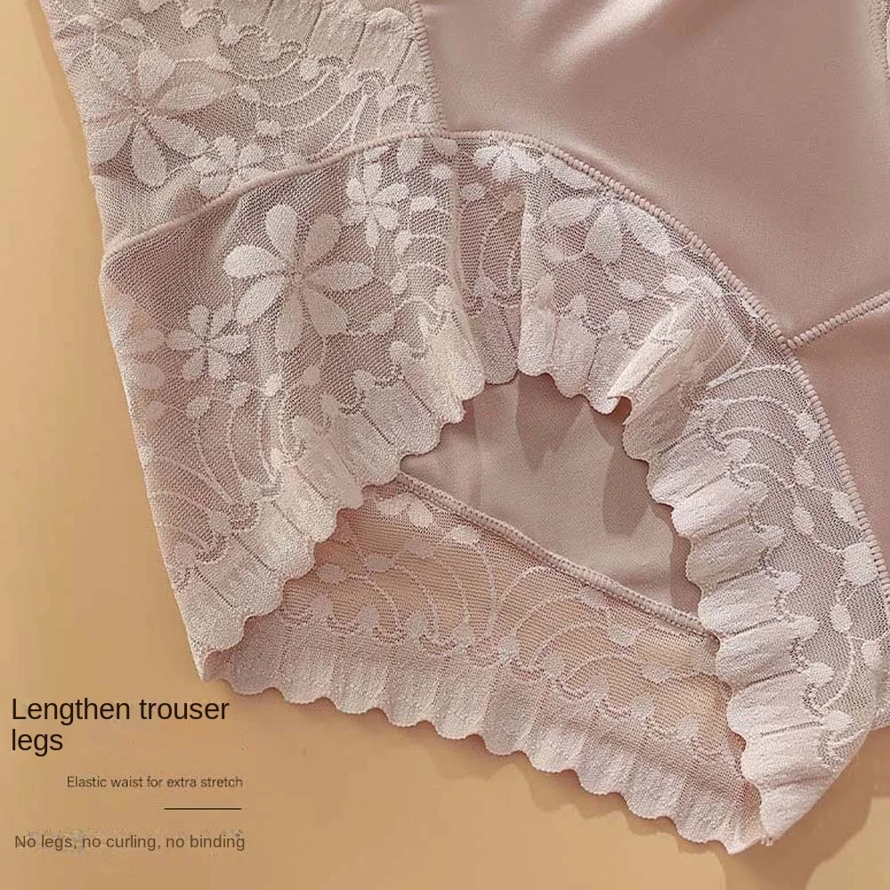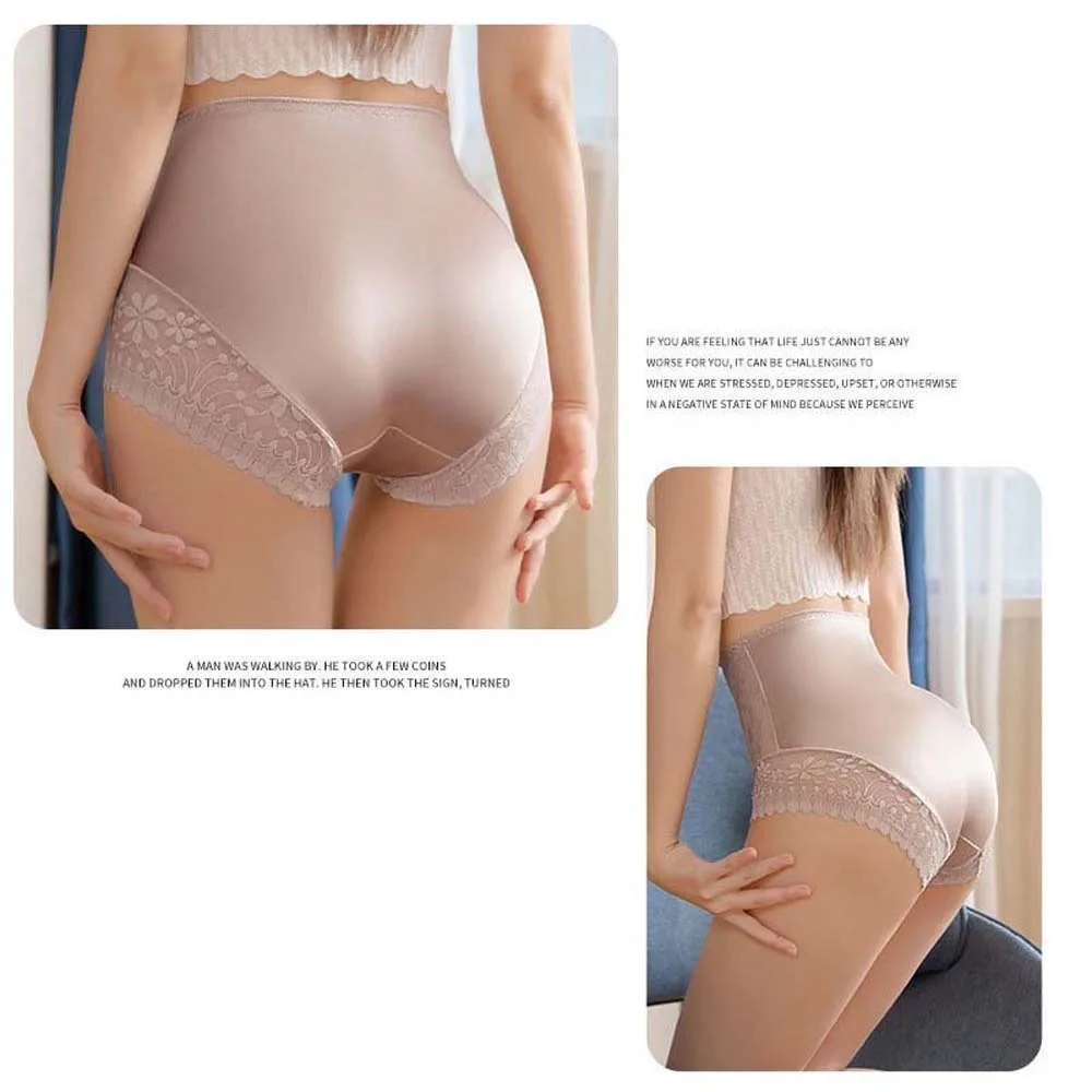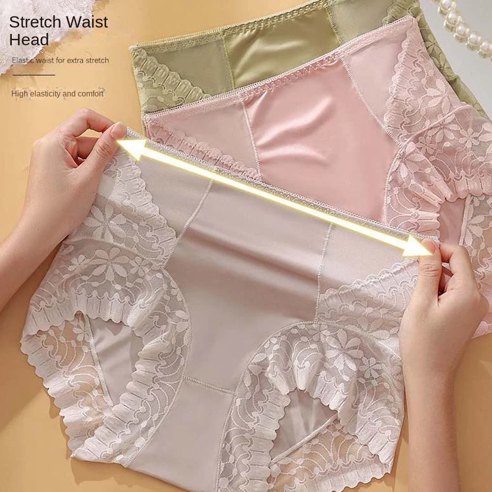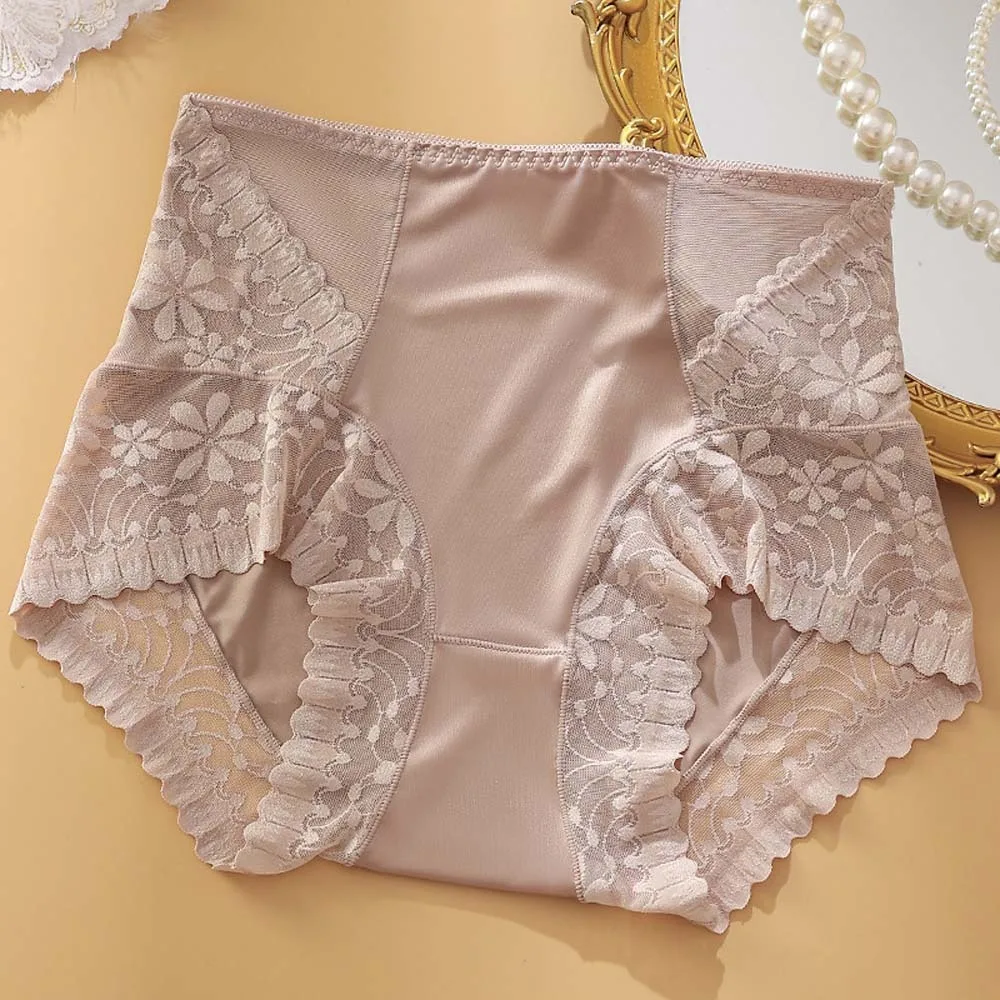 Satin Women Silk Panties Lingeries Belly Contracting Plus Size Briefs High Waist Solid Color Ice Silk Lace Underpants Girls