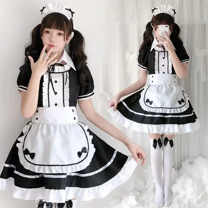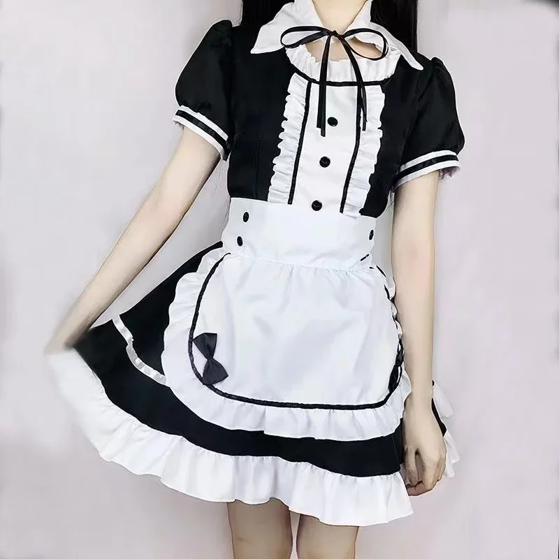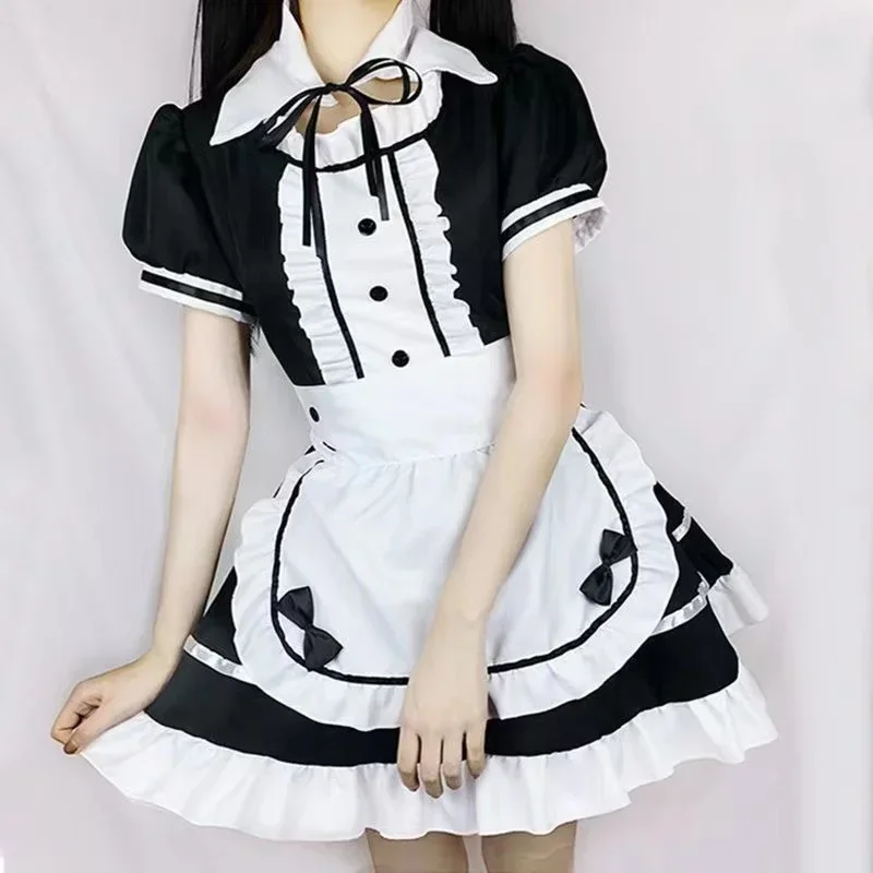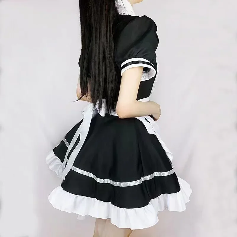 Sexy Lingerie Lolita Maid Cosplay Costume Women Headwear Apron Fake Collar Bowknot Black Dress Halloween Party Outfit