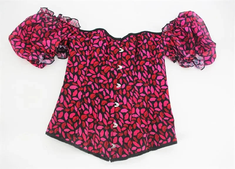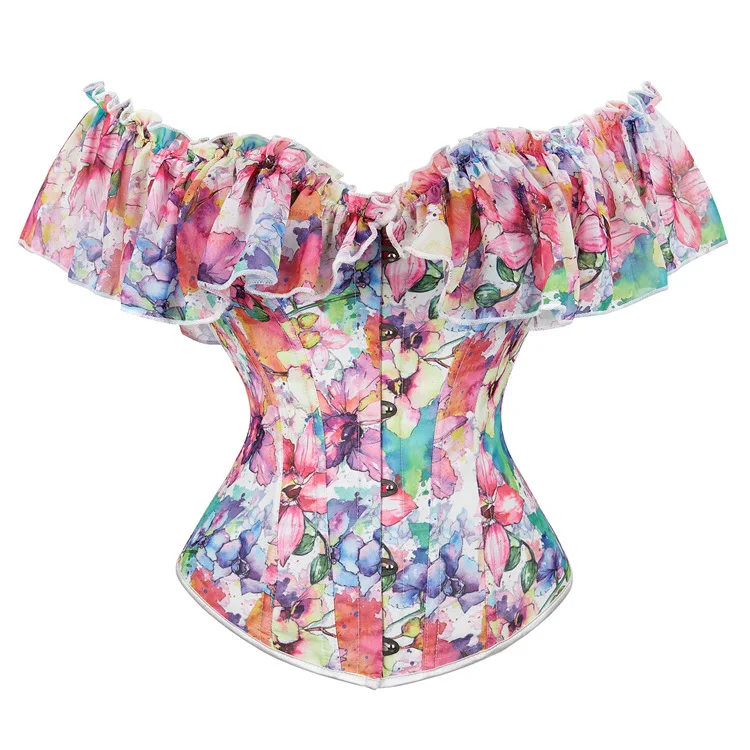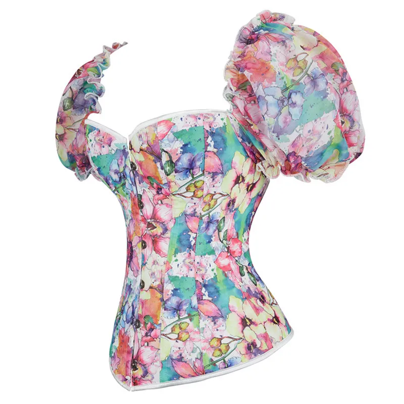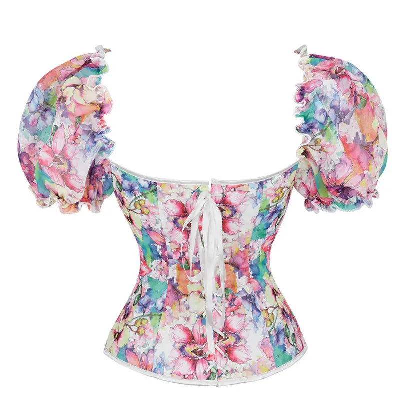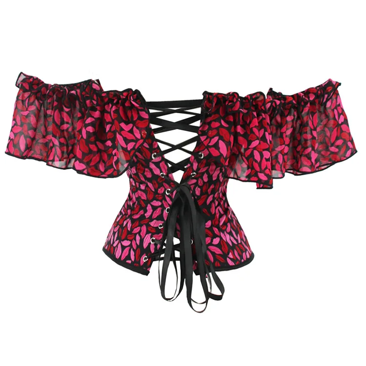 Sexy Women Off Shoulder Corset with Floral Lace Sleeve Lace Up Bustier Fishbone Overbust Corset Bodyshaper Lingerie Top