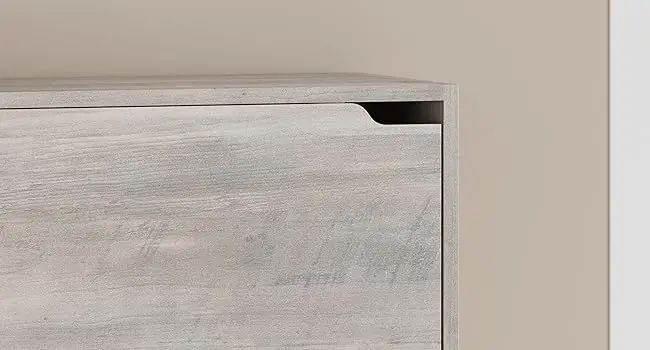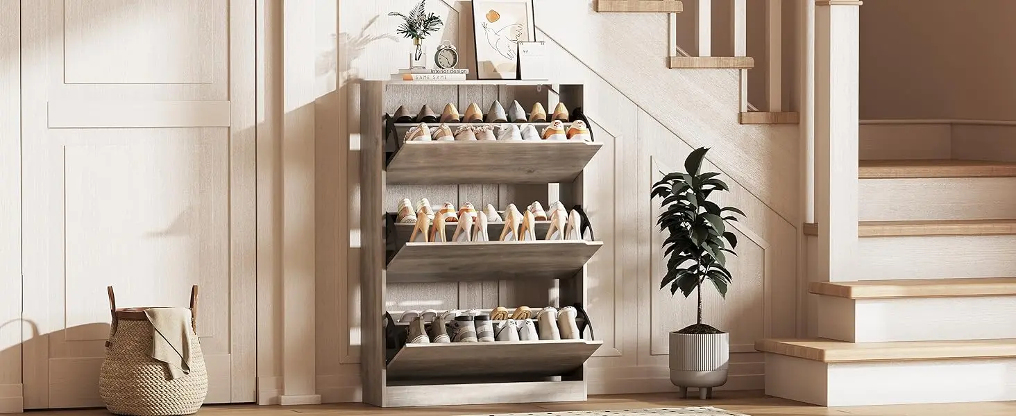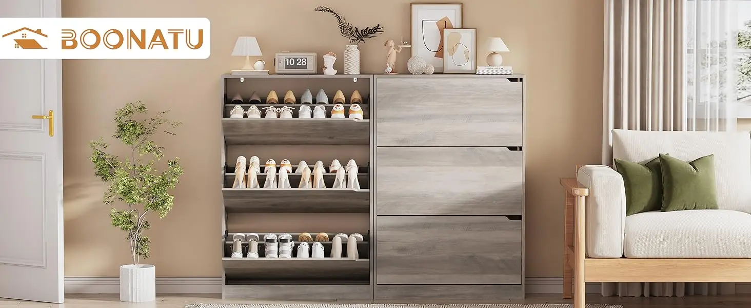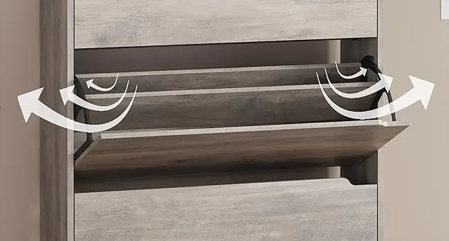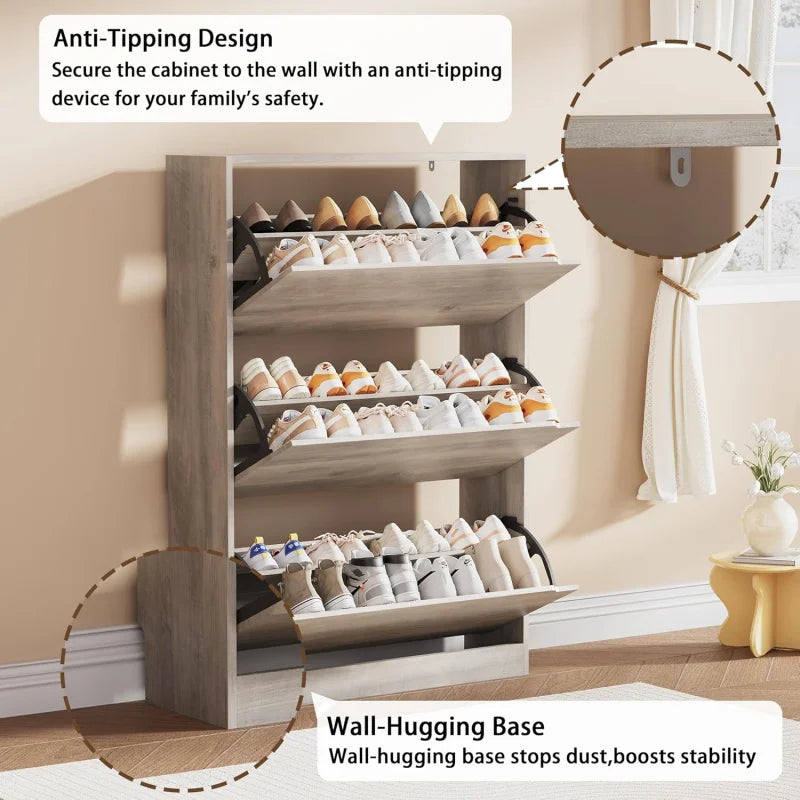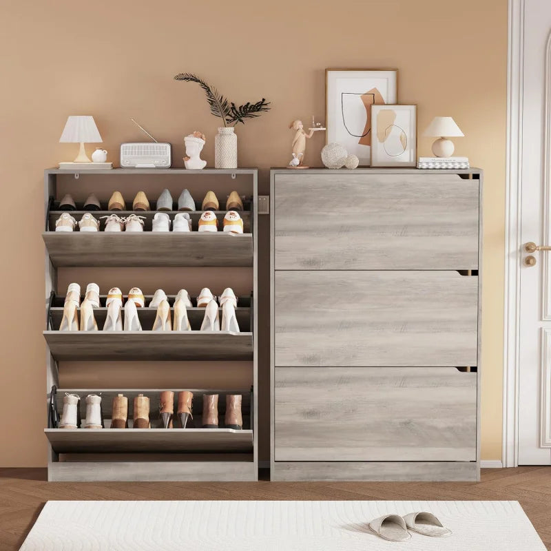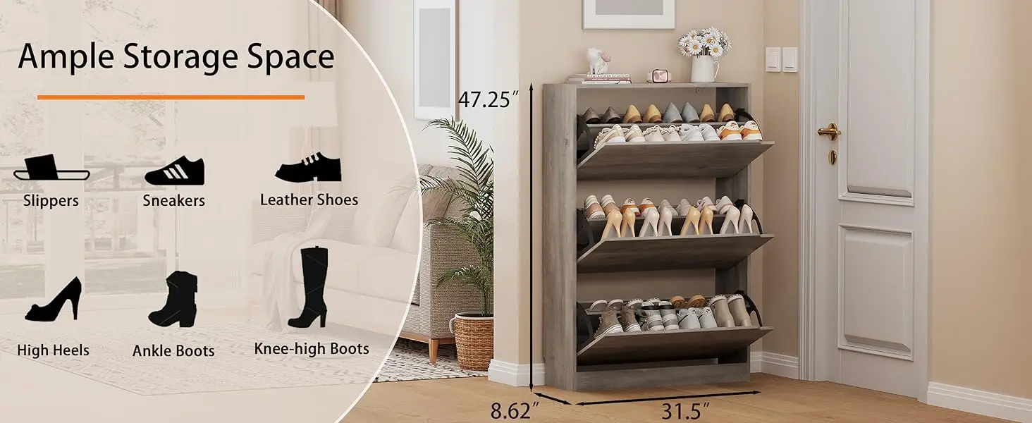 The space-saving design is suitable for limited space use.It has a slim rectangular shape and 3 tip-over drawers, each of which can accommodate two rows of shoes.