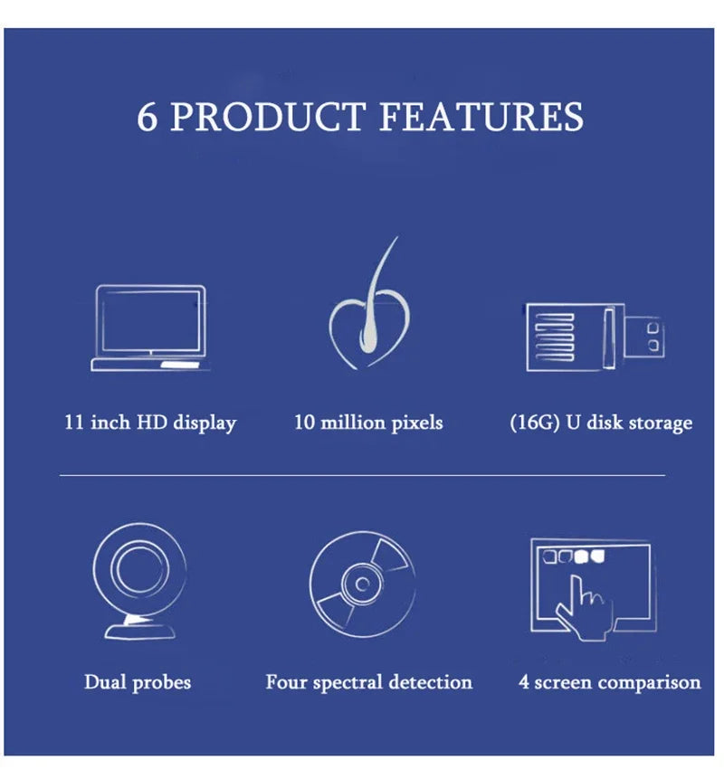 1. The instrument utilizes the optical principle to generate an image of the detected skin or hair through lens a cquisition and magnification, and displays on the screen what is invisible to the naked eye for analysis, andthen obtains a conclusion for detecting whether the human skin or hair is normal.