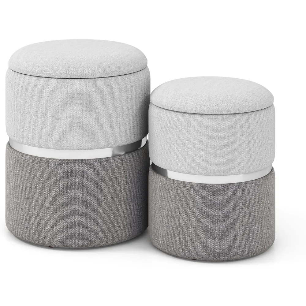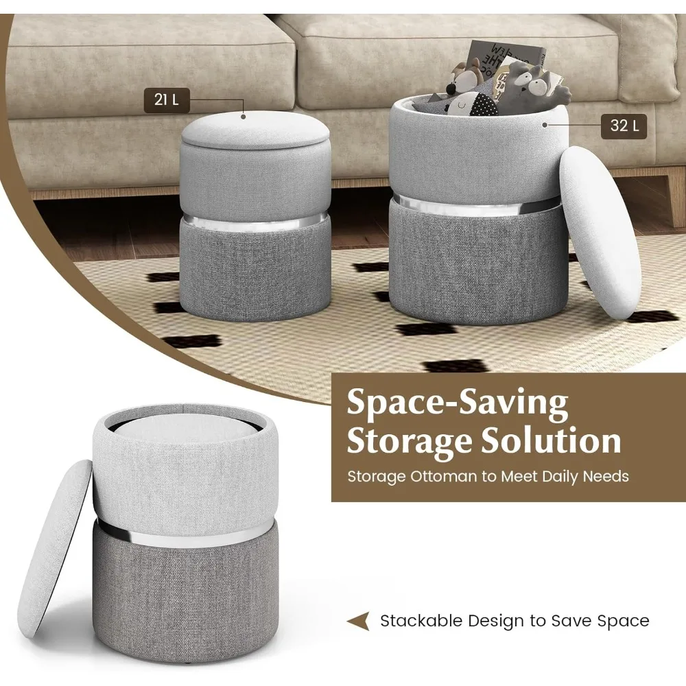 Storage Ottoman Set of 2, Modern Round Ottoman with Storage, Upholstered Linen Fabric Footrest with Sliver Hoop, Vanity