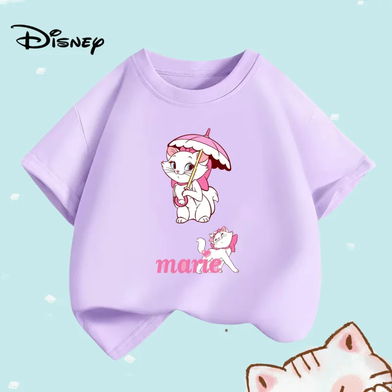 Summer Baby Girls Solid Clothes Kid Disney Marie Cat Printed Short Sleeve T-shirts Children Cartoon O-Neck Soft Breathable Top
