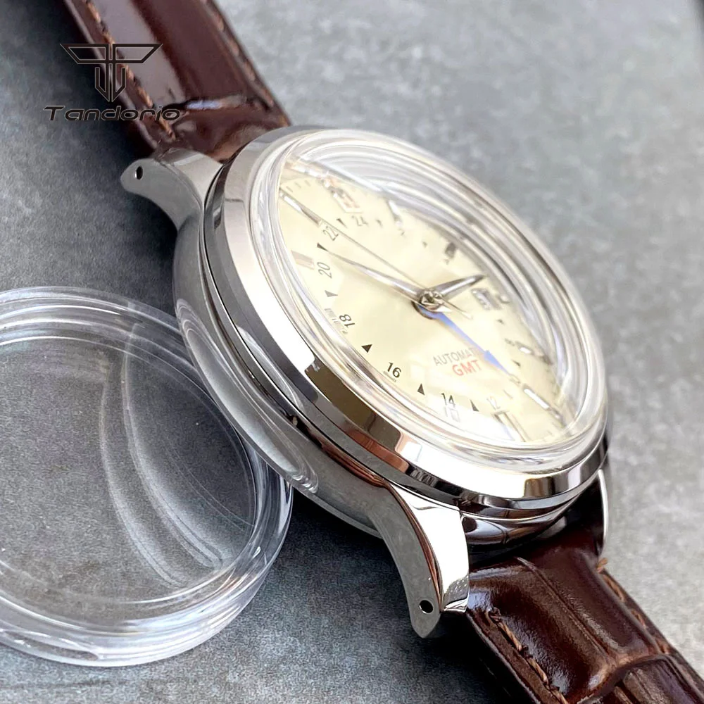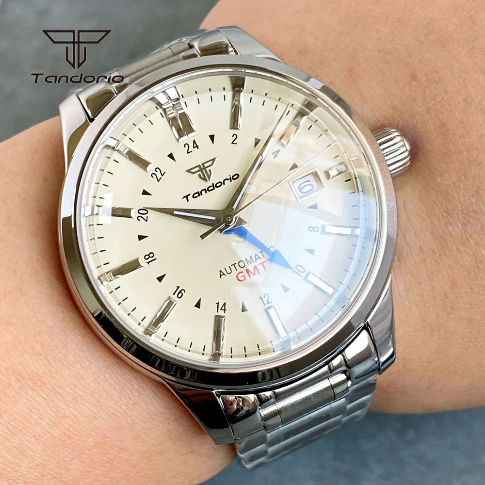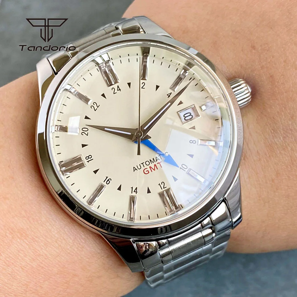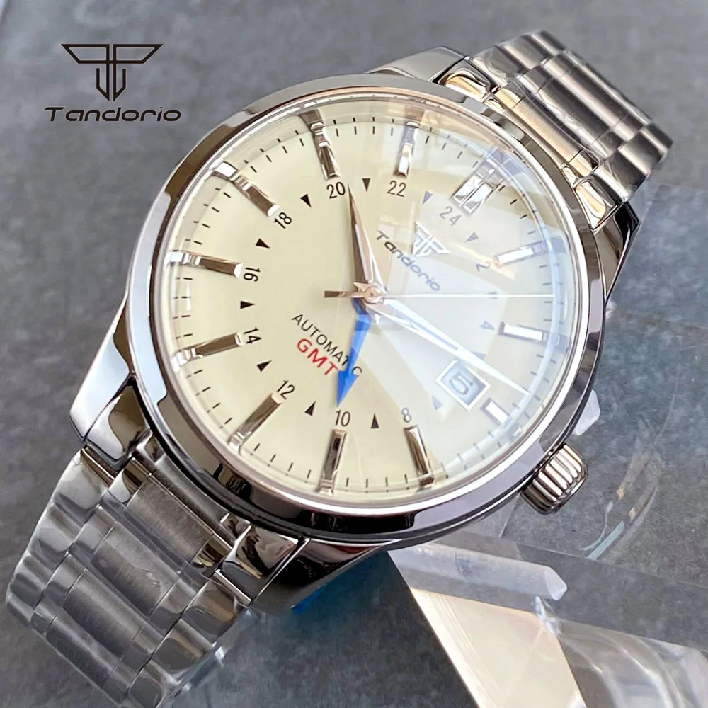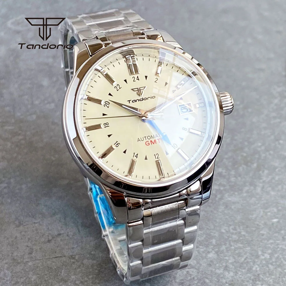 Tandorio Custom NH34 40mm Automatic Watch Double Domed Sapphire Date GMT Polished Dive Wristwatch for Men 20BAR Transparent Back