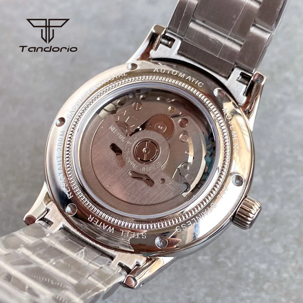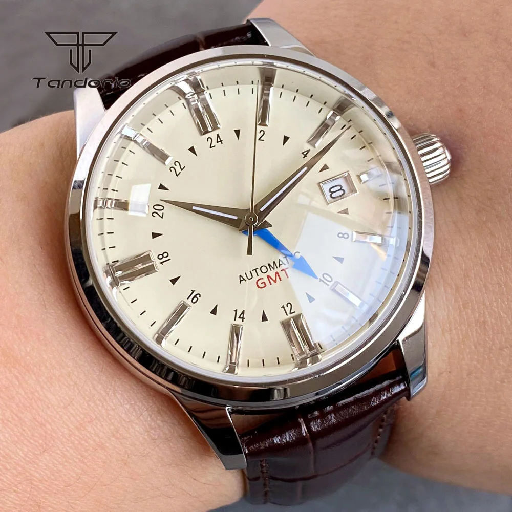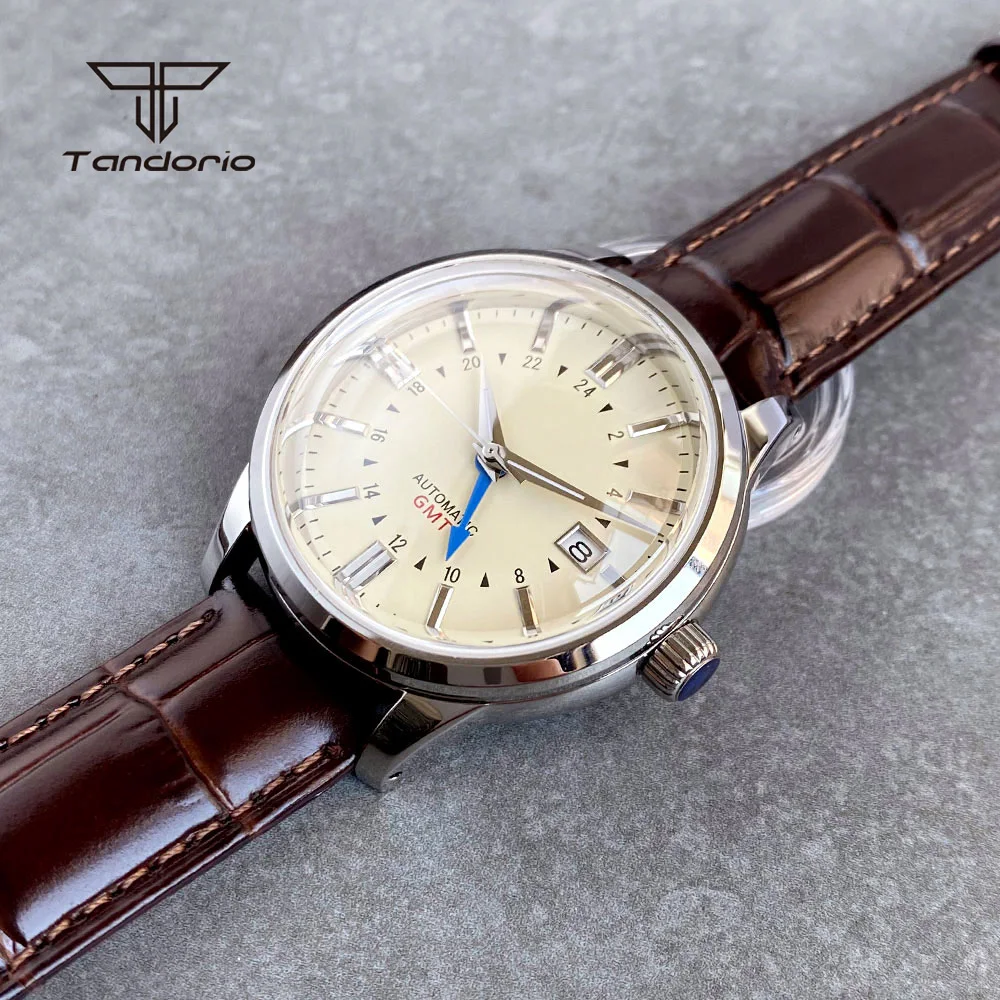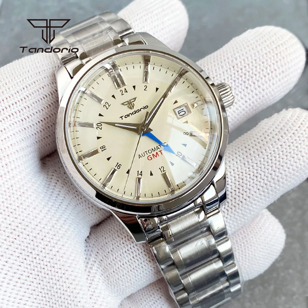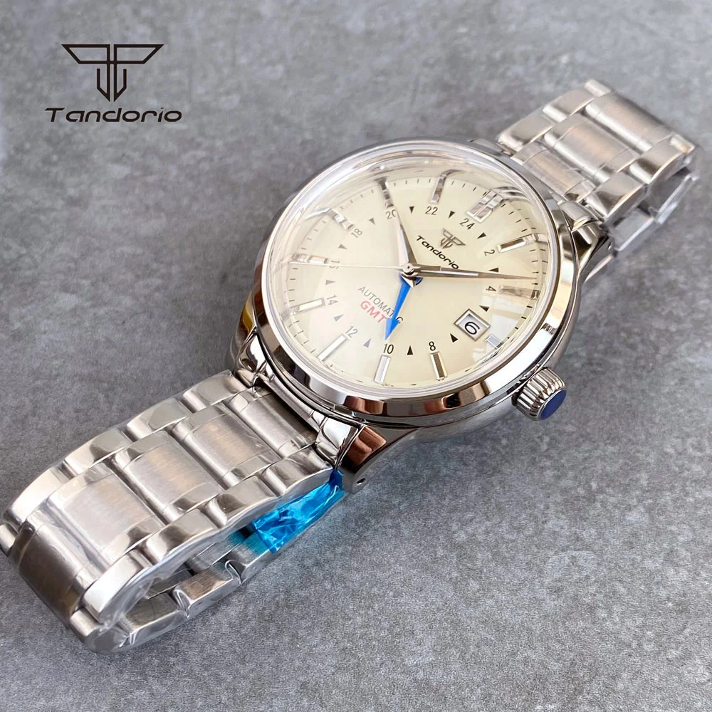 Tandorio Custom NH34 40mm Automatic Watch Double Domed Sapphire Date GMT Polished Dive Wristwatch for Men 20BAR Transparent Back