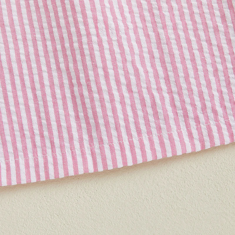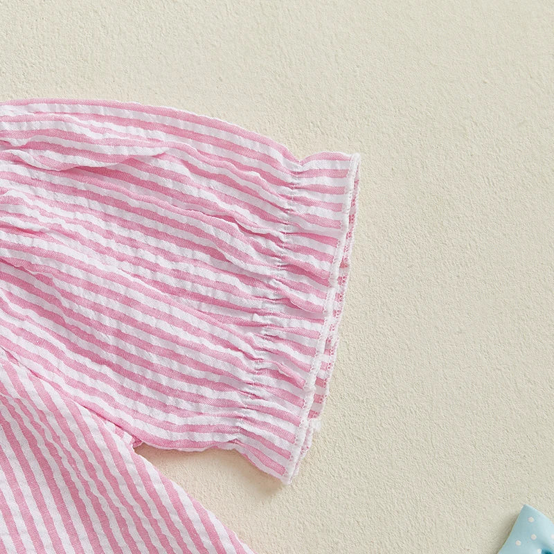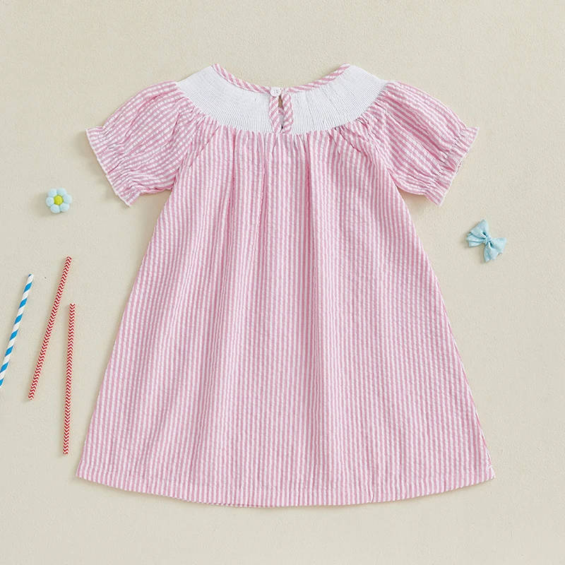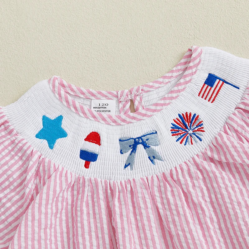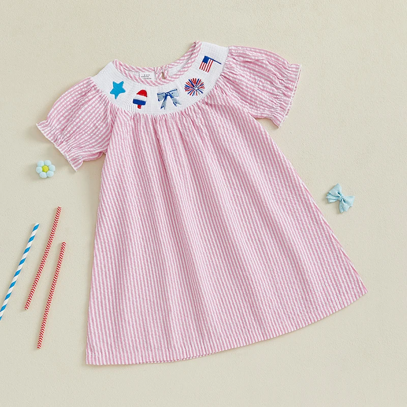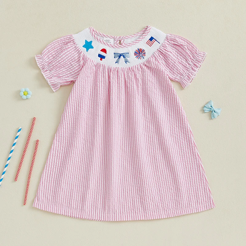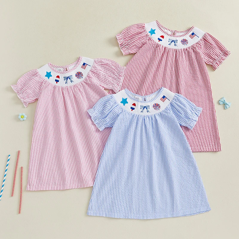 Baby Girl Summer Dress Short Sleeve Bow Flag Embroidery Stripes Print Loose Dress Toddler A-Line Dress