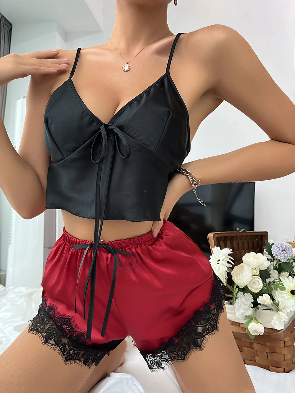 Women Pajamas Lingerie Set Satin Silk Camisole Shorts Sets Lace Two Pieces Sleepwear Top Shorts Nightwear Suits Underwear Pyjama