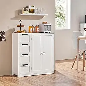 If extra toiletries and spare towels are piled up in your bathroom ensemble, having a spacious storage cabinet can help you hide all the clutter behind the door and out of sight.This 32″ L × 12″ W × 33″ H cabinet has 4 no-handle sliding drawers and 1 roomy cupboard, allows you to keep items of different sizes behind the doors.Once you have it, the storage space in your bathroom, kitchen, and sitting room will instantly expand.