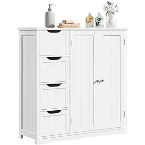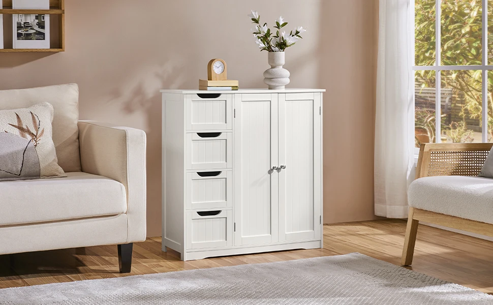 Furniture Organizer for Bathroom, Wooden Bathroom Floor Cabinet, Side Storage Cabinet with 4 Drawers and Double Doors