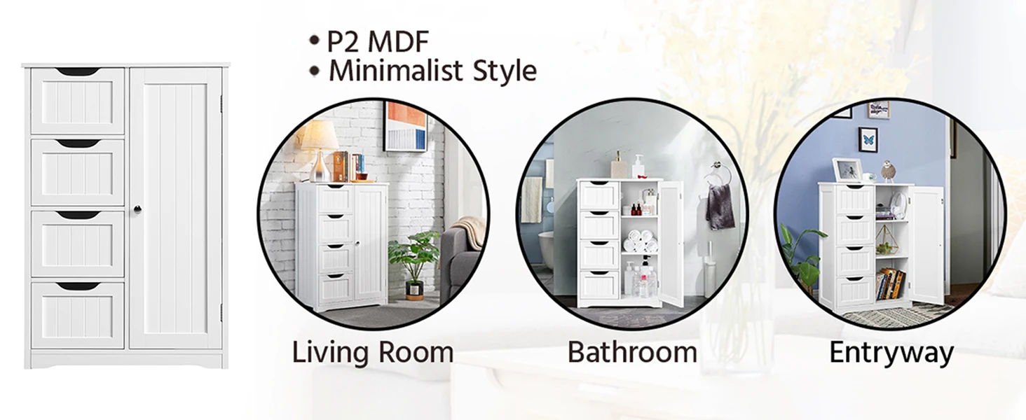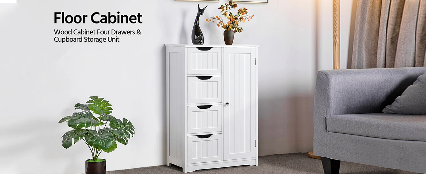 Wooden Floor Cabinet, Side Storage Organizer with 4 Drawers and 1 Cupboard, Freestanding Entryway Storage Unit Console