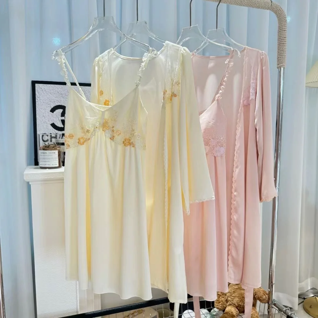 Yellow Princess Style Robe Set Sexy Lingerie Underwear Women Satin Sleepwear Sexy Lace Chemise Nightdress Short Bathrobe Suit